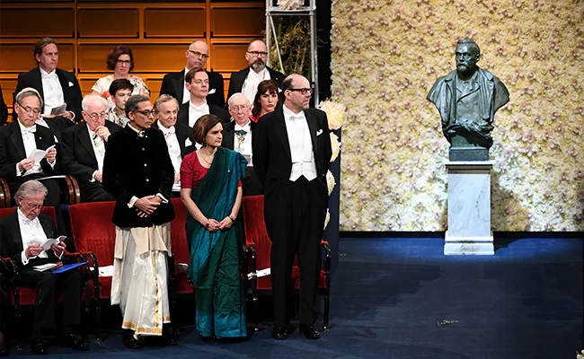অর্থনৈতিক বিজ্ঞানে ২০১৯ সালের নোবেল সম্মান অর্জন করেছেন ভারতীয়-আমেরিকান অর্থনীতিবিদ অভিজিৎ বন্দ্যোপাধ্যায় এবং এস্থার দুফলো ও মাইকেল ক্রেমারের জুটি! মঙ্গলবার সুইডেনে নোবেল সম্মান গ্রহণ করলেন তারা। অভিজিৎ বন্দ্যোপাধ্যায় এবং এস্থার ডুফ্লো স্টকহোমের কনসার্ট হলে এই বিশেষ পুরষ্কারের মঞ্চে উঠেছিলেন খাঁটি বাঙালি পোশাকে। ৫৮ বছর বয়সী নোবেলজয়ী অভিজিৎ বন্দ্যোপাধ্যায় ক্রিম রঙের পাঞ্জাবী এবং সোনালি পাড়ের সাদা কেরলের বিশেষ ধুতি বা মুন্ডু এবং গলাবন্ধ কালো জ্যাকেটে সেজেছিলেন। অন্যদিকে ফরাসি-আমেরিকান এস্থার দুফলো এই বিশেষ দিনে নীলাম্বরী! নীল শাড়ি, লাল ব্লাউজ এবং লাল টিপে একেবারে ভিন্ন রূপে নোবেল সম্মান নিতে মঞ্চে ওঠেন স্বামী-স্ত্রী’র জুটি। প্রথাগত সংস্কৃতির পোশাকেই দেখা গিয়েছে অপর নোবেলজয়ী মাইকেল ক্রেমারকে।