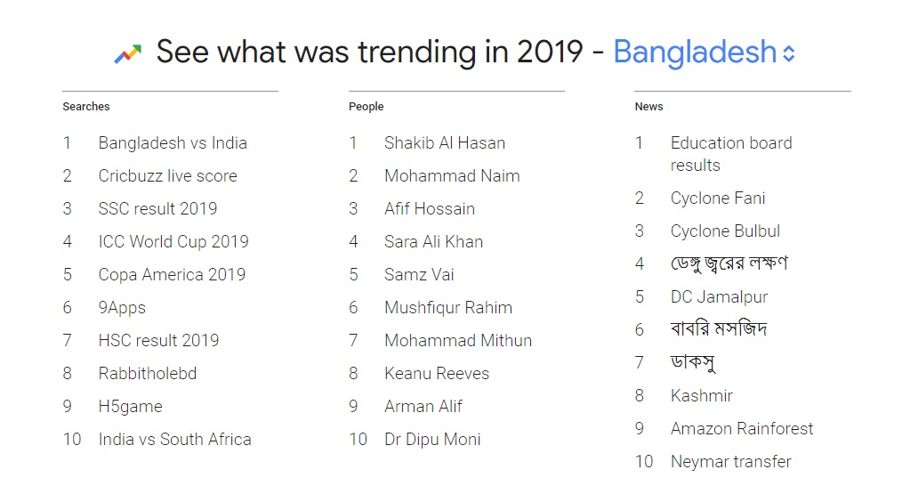 ২০১৯ সালের বাংলাদেশের সার্চ ট্রেন্ড বা সবচেয়ে বেশি খোঁজা হয়েছে এই তালিকাটি ‘সার্চেস’, ‘পিপল’ ও ‘নিউজ’—এই তিনটি ক্যাটাগরিতে প্রকাশ করেছে গুগল।