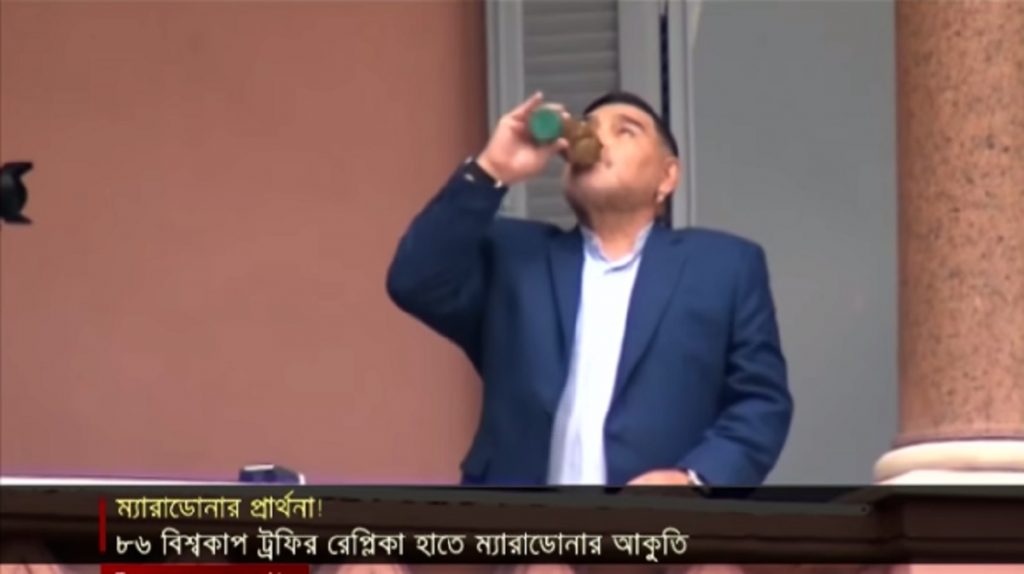 এদিন ‘৮৬ বিশ্বকাপ ট্রফির রেপ্লিকা হাতে আবেগঘন মুহুর্ত উপহার দিলেন এই ফুটবল ঈশ্বর। ছোট এই রেপ্লিকা নিয়েও মজা করতে ছাড়েননি তিনি।