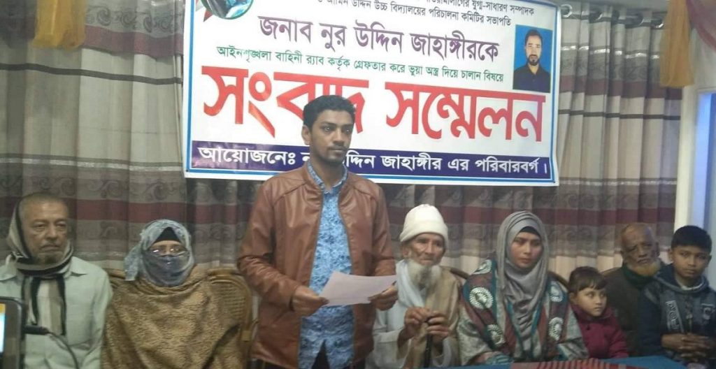 পরে সন্ধ্যায় ব্যাগের মধ্যে একটি পিস্তল, একটি পাইপগান ও দুটি কার্তুজ সহ নুর উদ্দিনকে গ্রেফতার দেখিয়ে থানায় হস্তান্তর করে র্যাব। এ ঘটনার তীব্র নিন্দা জানিয়েছেন ভুক্তভোগী পরিবার। তাদের দাবি একটি কুচক্রী মহলের ইন্ধনে র্যাব সদস্যরা এমন ঘটনা ঘটিয়েছেন। বর্তমানে পরিবারটি নিরাপত্তাহীনতায় ভুগছেন। তাই তারা প্রধানমন্ত্রীর হস্তক্ষেপ কামনা করছে।