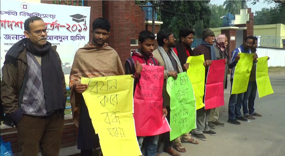 ঢাকা বিশ্ববিদ্যালয়ের শিক্ষার্থী ধর্ষণের প্রতিবাদে মানববন্ধন করেছে রাজশাহী বিশ্ববিদ্যালয়ের সাধারণ শিক্ষার্থীরা। মঙ্গলবার দুপুর ১২ দিকে বিশ্ববিদ্যালয়ের প্রধান ফটকের সামনে অবস্থান নিয়ে এ কর্মসূচি পালন করেন তারা। এ সময় বক্তারা ধর্ষণকান্ডে জড়িতদের দ্রুত গ্রেফতার করে বিচারের আওতায় আনার পাশাপাশি নারীর নিরাপত্তায় রাষ্ট্রকে আরো সক্রিয় ভূমিকা পালনের আহ্বান জানান।