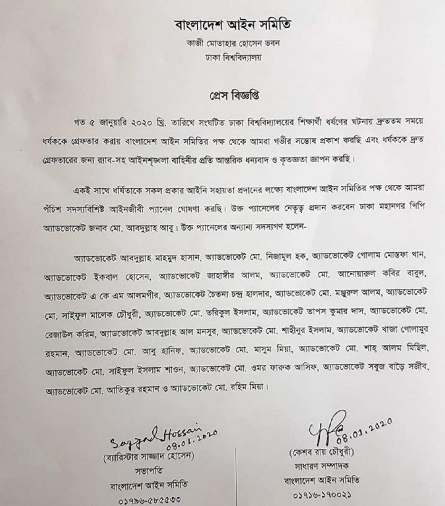 বিবৃতিতে আরো বলা হয়, একই সাথে ধর্ষিতাকে সকল প্রকার আইনি সহায়তা প্রদানের লক্ষ্যে বাংলাদেশ আইন সমিতির পক্ষ থেকেপঁচিশ সদস্যবিশিষ্ট আইনজীবী প্যানেল ঘোষণা করা হয়েছে। উক্ত প্যানেলের নেতৃত্ব প্রদান করবেন ঢাকা মহানগর পিপি অ্যাডভোকেট জনাব মো. আবদুল্লাহ আবু। উক্ত প্যানেলের অন্যান্য সদস্যগণ হলেন- অ্যাডভোকেট আবদুল্লাহ মাহমুদ হাসান, অ্যাডভোকেট মো. নিজামুল হক, অ্যাডভোকেট গোলাম মোস্তফা খান, অ্যাডভোকেট ইকবাল হোসেন, অ্যাডভোকেট জাহাঙ্গীর আলম, অ্যাডভোকেট মো. আনোয়ারুল কবির বাবুল, অ্যাডভোকেট এ কে এম আলমগীর, অ্যাডভোকেট চৈতন্য চন্দ্র হালদার, অ্যাডভোকেট মো. মঞ্জুরুল আলম, অ্যাডভোকেট মো. সাইফুল মালেক চৌধুরী, অ্যাডভোকেট মো. তরিকুল ইসলাম, অ্যাডভোকেট তাপস কুমার দাস, অ্যাডভোকেট মো. রেজাউল করিম, অ্যাডভোকেট আবদুল্লাহ আল মনসুর, অ্যাডভোকেট মো. শাহীনুর ইসলাম, অ্যাডভোকেট খাজা গোলামুর রহমান, অ্যাডভোকেট মো. আবু হানিফ, অ্যাডভোকেট মো. মাসুম মিয়া, অ্যাডভোকেট মো. শাহ্ আলম মিছিল, অ্যাডভোকেট মো. সাইফুল ইসলাম শাওন, অ্যাডভোকেট মো. ওমর ফারুক আসিফ, অ্যাডভোকেট সবুজ বাড়ৈ সজীব, অ্যাডভোকেট মো. আতিকুর রহমান ও অ্যাডভোকেট মো. রহিম মিয়া।