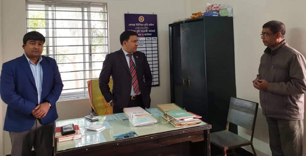 এ সময় ভূমি অফিসে উপস্থিত সেবা গ্রহীতাদের সাথে কুশল বিনিময়কালে এক সেবা গ্রহীতা অভিযোগ করে জেলা প্রশাসককে বলেন, অতিরিক্ত টাকা দিলেও তার কাজ করে দিচ্ছেন না ইউনিয়ন সহকারী ভূমি কর্মকর্তা। জেলা প্রশাসক বিষয়টি আমলে নিয়ে তার কাছে ঘুষ গ্রহণকারী ভূমি কর্মকর্তার নাম জানতে চান। ওই সেবা গ্রহীতা ভোমরা ইউনিয়ন সহকারী ভূমি কর্মকর্তা মহাসীন হোসেনের নাম বললে জেলা প্রশাসক তাকে তাৎক্ষণিকভাবে সাময়িক বরখাস্তের নির্দেশ দেন।