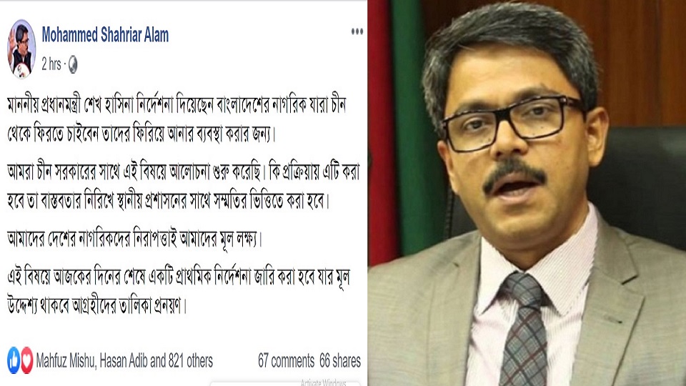 তিনি বলেন, ‘মাননীয় প্রধানমন্ত্রী শেখ হাসিনা নির্দেশনা দিয়েছেন বাংলাদেশের নাগরিক যারা চীন থেকে ফিরতে চাইবেন তাদের ফিরিয়ে আনার ব্যবস্থা করার জন্য। আমরা চীন সরকারের সাথে এই বিষয়ে আলোচনা শুরু করেছি। কি প্রক্রিয়ায় এটি করা হবে তা বাস্তবতার নিরিখে স্থানীয় প্রশাসনের সাথে সম্মতির ভিত্তিতে করা হবে। আমাদের দেশের নাগরিকদের নিরাপত্তাই আমাদের মূল লক্ষ্য। এই বিষয়ে আজকে দিনের শেষে একটি প্রাথমিক নির্দেশনা জারি করা হবে যার মূল উদ্দেশ্য থাকবে আগ্রহীদের তালিকা প্রণয়ন।’