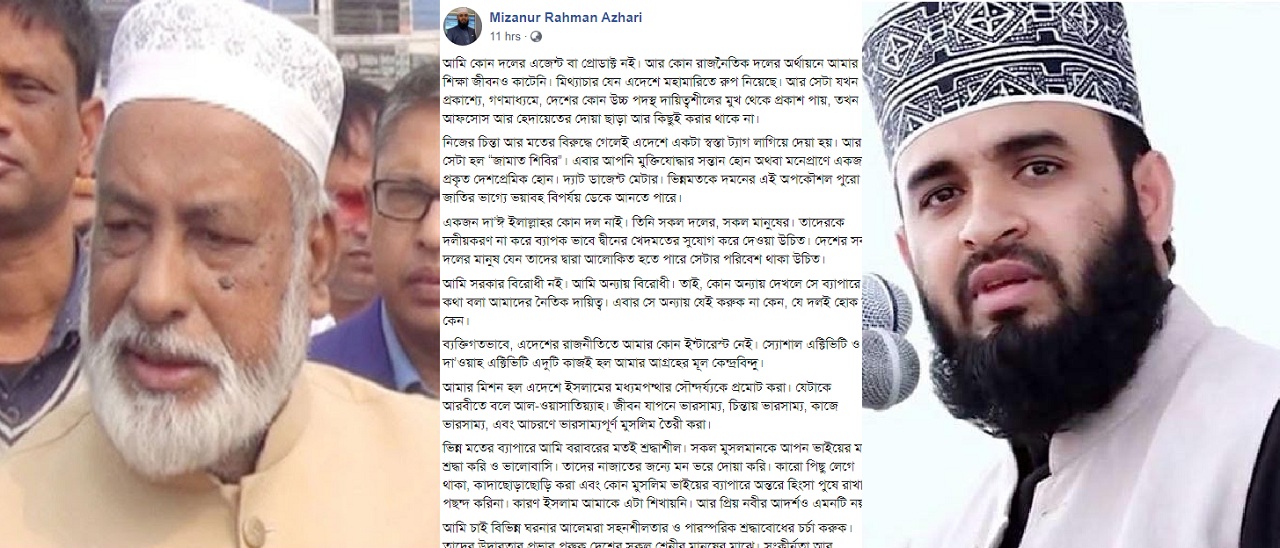 আমি কোন দলের এজেন্ট বা প্রোডাক্ট নই। আর কোন রাজনৈতিক দলের অর্থায়নে আমার শিক্ষা জীবনও কাটেনি। মিথ্যাচার যেন এদেশে মহামারিতে রুপ নিয়েছে। আর সেটা যখন প্রকাশ্যে, গণমাধ্যমে, দেশের কোন উচ্চ পদস্থ দায়িত্বশীলের মুখ থেকে প্রকাশ পায়, তখন আফসোস আর হেদায়েতের দোয়া ছাড়া আর কিছুই করার থাকে না। এসব কথা জনপ্রিয় ধর্মীয় বক্তা মিজানুর রহমান আজহারীর।
