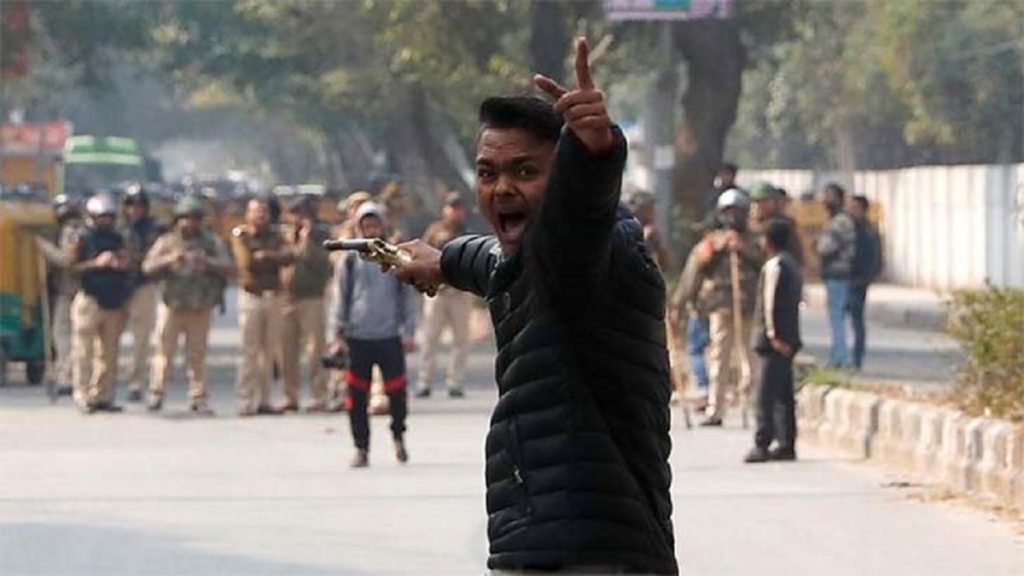 দেখা গেছে, জামিয়া মিলিয়া ইসলামিয়া বিশ্ববিদ্যালয়ে বিক্ষোভকারীদের বিরুদ্ধে স্লোগান দিচ্ছেন অস্ত্রধারী এক লোক। এরপর প্রতিবাদকারীদের লক্ষ্য করে তিনি গুলি ছুঁড়েন।