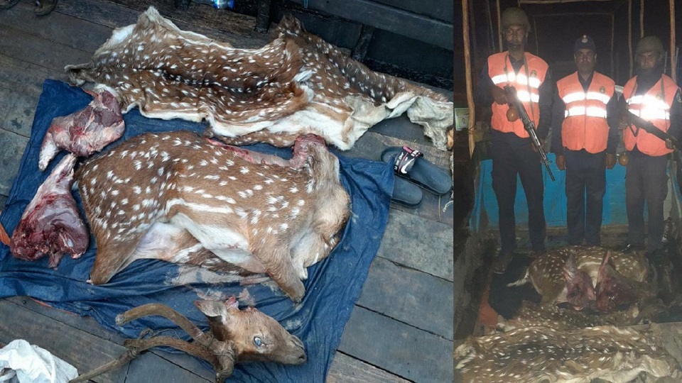 সুন্দরবন থেকে হরিণের ৫০ কেজি মাংস, ৩টি হরিণের চামড়া ও ১টি হরিণের মাথা উদ্ধার করেছে কোস্টগার্ড।