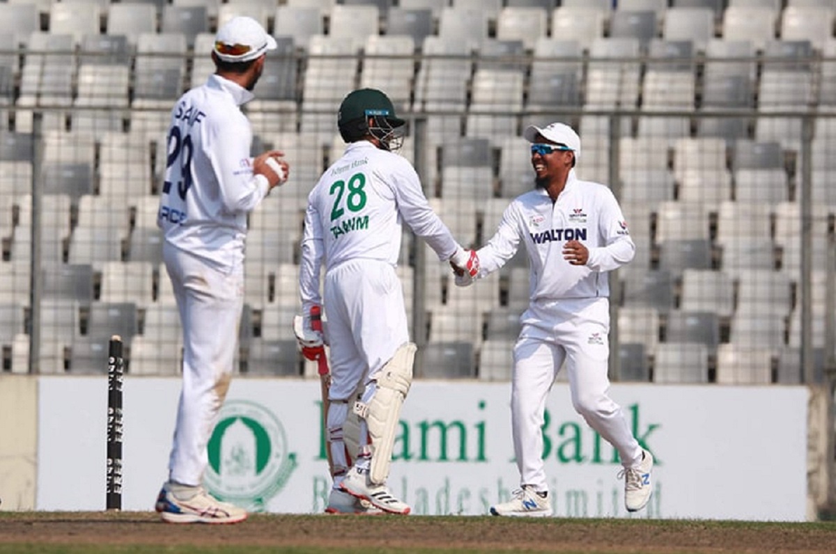 শুভাগত হোমের ফুললেংথের বল মিডউইকেটে ঠেলে দিয়ে ৪০৭ বলে ট্রিপল পূর্ণ করেন তামিম। মাঠে থেকেই নিজের বিরল রেকর্ডে ভাগ বসাতে দেখলেন রকিবুল। প্রথম অভিনন্দন তামিমকে তিনিই জানান। শর্ট-মিডউইকেটই থেকে এগিয়ে গিয়ে হাত মেলান।