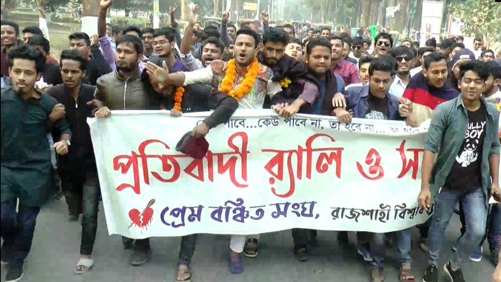 সারাদেশে ঘটা করে যখন প্রিয়জনের প্রতি ভালোবাসা প্রকাশে ব্যস্ত তরুণ যুবাসহ বিভিন্ন বয়সীরা তখন রাজশাহী বিশ্ববিদ্যালয়ে প্রতিবাদে সভা-সমাবেশ করেছে চিরকুমার সভা ও প্রেম বঞ্চিত সংঘ।
