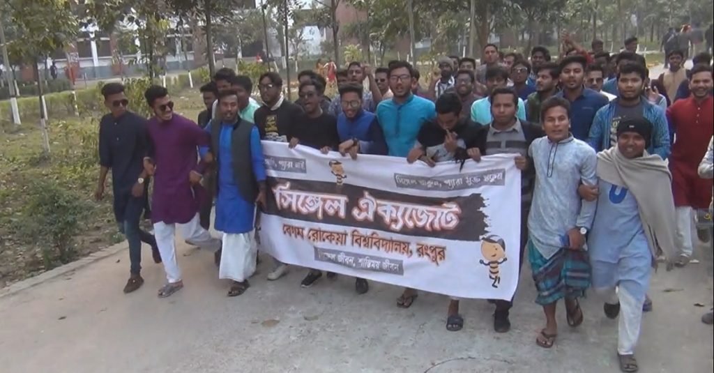 শুক্রবার বেলা সাড়ে তিনটা থেকে রোকেয়া বিশ্ববিদ্যালয়ের সিঙ্গেল চত্বরে একত্রিত হতে থাকে শিক্ষার্থীরা। সেখান থেকে তারা বিকেল চারটায় একটি বিক্ষোভ নিয়ে ক্যাম্পাসের বিভিন্ন সড়ক প্রদক্ষিণ শেষে পার্কের মোড়ে যায়। এ সময় তারা বিভিন্ন স্লোগানে মুখরিত করেন ক্যাম্পাস।