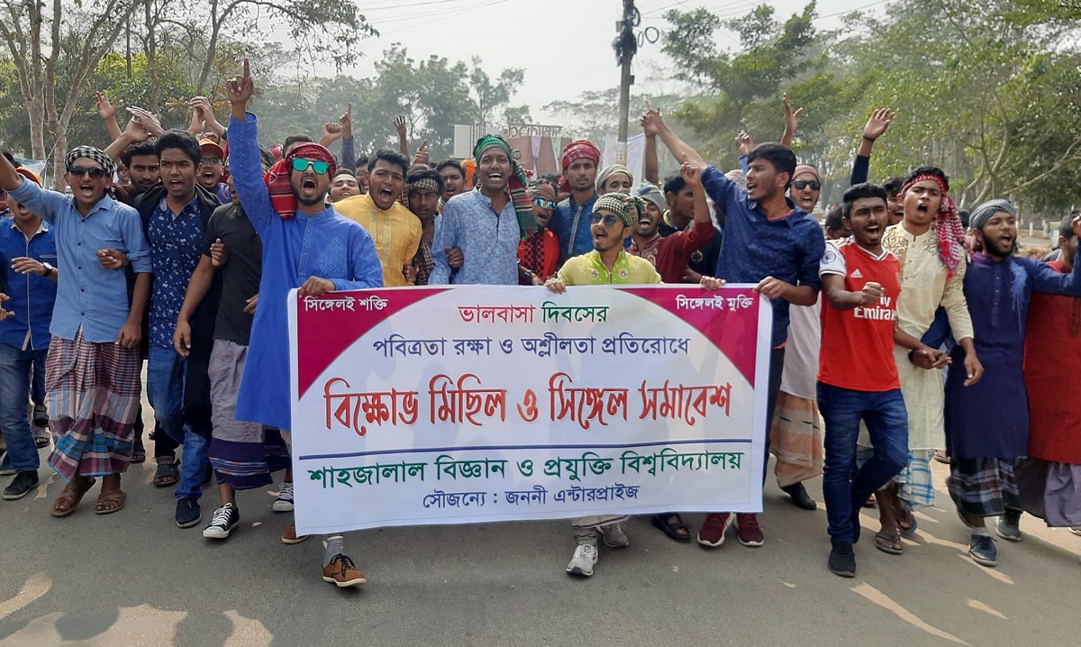সিলেটে ভালোবাসা দিবসের পবিত্রতা রক্ষা ও অশ্লীলতা প্রতিরোধে বিক্ষোভ মিছিল ও সমাবেশ করেছে শাবিপ্রবির শিক্ষার্থীদের সংগঠন সিঙ্গেল শিক্ষার্থী ফোরাম। শুক্রবার সকালে শাবিপ্রবির ডি বিল্ডিং থেকে বিক্ষোভ মিছিল টি শুরু হয়ে ক্যাম্পাস প্রদক্ষিণ করে কেন্দ্রীয় গ্রন্থাগারের সামনে এসে সিঙ্গেল সমাবেশে মিলিত হয় তারা।