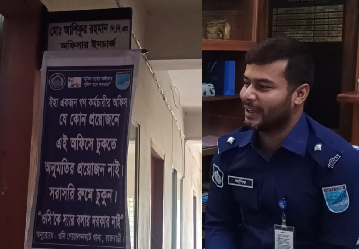 আমাদের দেশে সাধারণত থানায় ওসির রুমে ঢুকতে লাগে নানা ধরনের অনুমতি। একজন গ্রামের সাধারণ খেটে খাওয়া দিন মজুর সরাসরি ওসির রুমে ঢুকে তার সাথে কথা বলবে এটা সচরাচর দেখা যায় না। কিন্তু থানায় গিয়ে যদি দেখেন ওসির রুমের দরজায় ঝুলছে একটি লেখা যে ‘ইহা একজন গণ কর্মচারীর অফিস। যে কোন প্রয়োজনে এই অফিসে ঢুকতে অনুমতির প্রয়োজন নাই। সরাসরি রুমে ঢুকুন। ওসিকে স্যার বলার দরকার নাই’। ভিন্নধর্মী এই উদ্যোগ গ্রহণ করে রাজবাড়ী জেলার গোয়ালন্দ ঘাট থানার অফিসার ইনচার্জ (ওসি) মোঃ আশিকুর রহমান প্রশংসা পাচ্ছেন। ওসির এমন উদার মহানুভবতায় অবাক জেলাবাসীসহ থানায় আইনী সেবা নিতে আসা সাধারণ জনগণ।