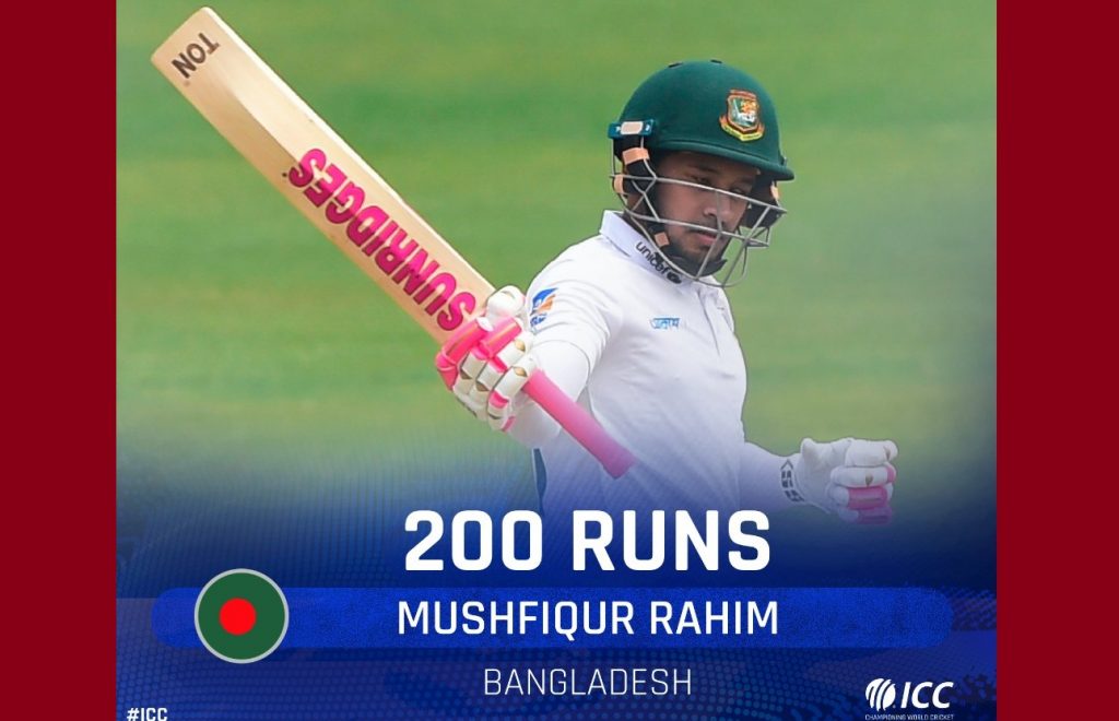 এদিকে, লাঞ্চের পরই সপ্তম সেঞ্চুরি এবং শেষ বিকেলে তৃতীয় ডাবল সেঞ্চুরি তুলে নেন মুশফিক। শেষ পর্যন্ত অপরাজিত থাকেন ২০৩ রানে। তার সবশেষ ডাবলটিও ছিল জিম্বাবুইয়ানদের বিপক্ষে। গেল নভেম্বরে ঘরের মাঠে।