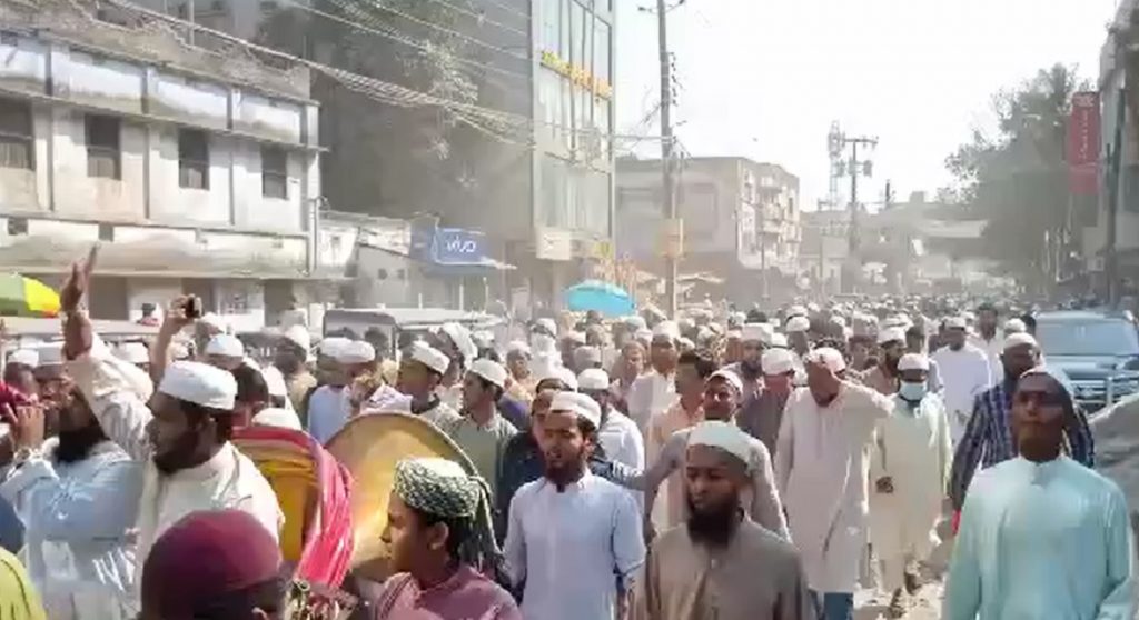 বিক্ষোভ মিছিল হয়েছে নরসিংদীতেও। জুমার নামাজ পর বিভিন্ন মসজিদ থেকে আসা মুসল্লিরা পৌরসভার সামনে জড়ো হন। শুরুতে কর্মসূচিতে বাধা দেয়ার চেষ্টা করে পুলিশ। পরে বিভিন্ন সড়ক ঘুরে জেলখানা মোড়ে গিয়ে মিছিল শেষ হয়। এসময় বক্তারা ভারতে সহিংসতা-সংঘাত বন্ধের দাবি জানান।