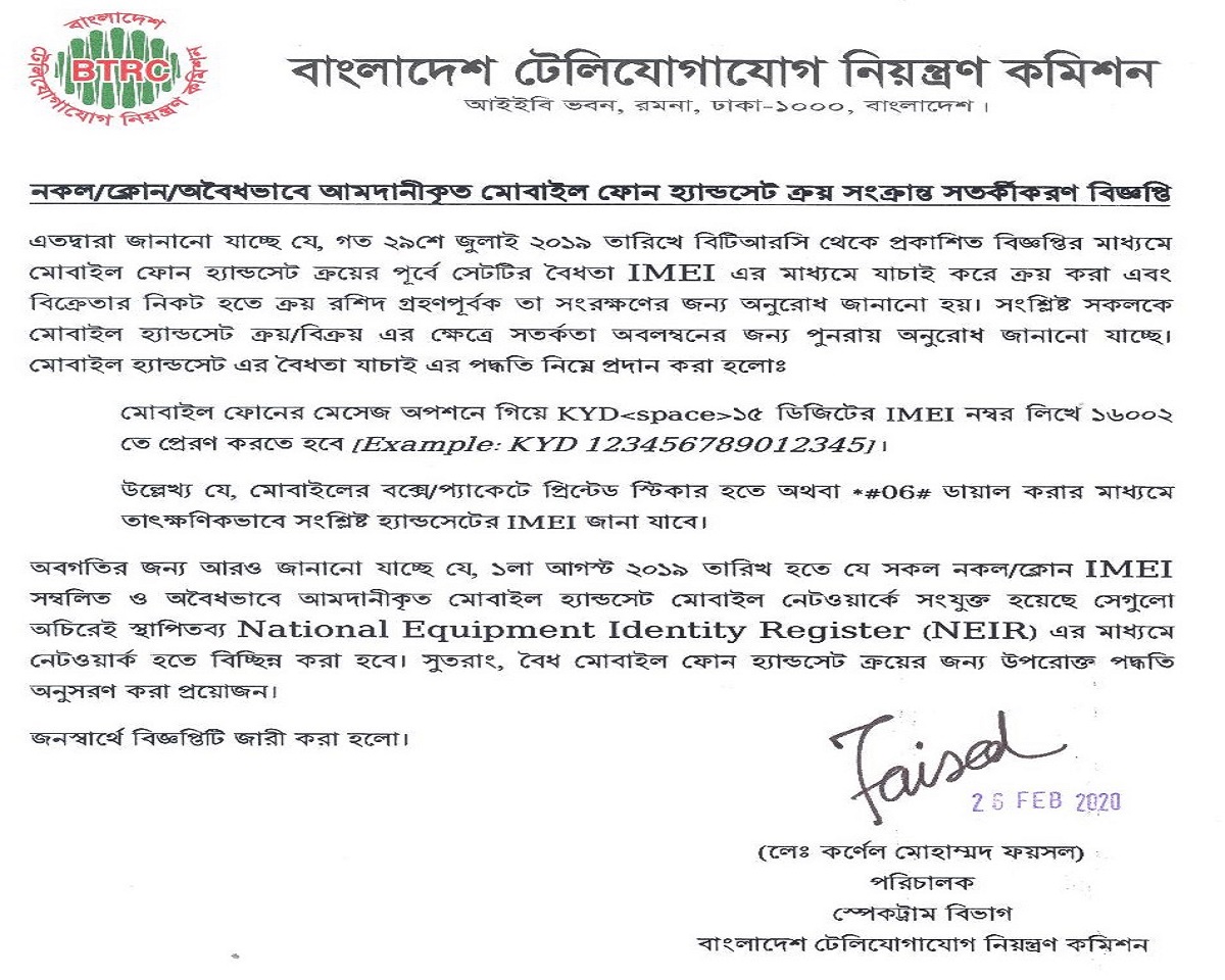ক্লোন করা ও আইএমইআই নকল করা সকল মোবাইল হ্যান্ডসেট অকার্যকর করে দেবে বাংলাদেশ টেলিযোগাযোগ নিয়ন্ত্রক সংস্থা -বিটিআরসি।