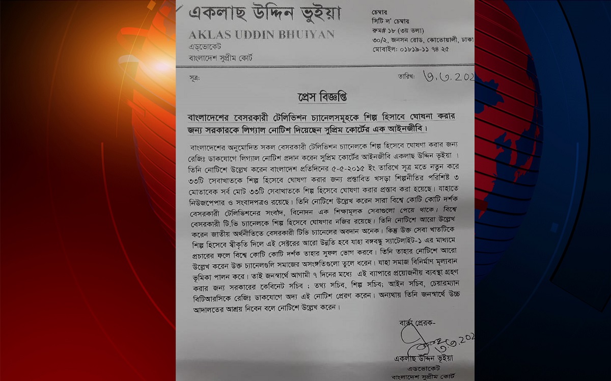 বেসরকারি টেলিভিশন চ্যানেলগুলোকে শিল্প হিসেবে ঘোষণা করতে সরকারকে আইনী নোটিশ পাঠিয়েছেন সুপ্রিমকোর্টের আইনজীবী একলাছ উদ্দিন ভূইয়া।