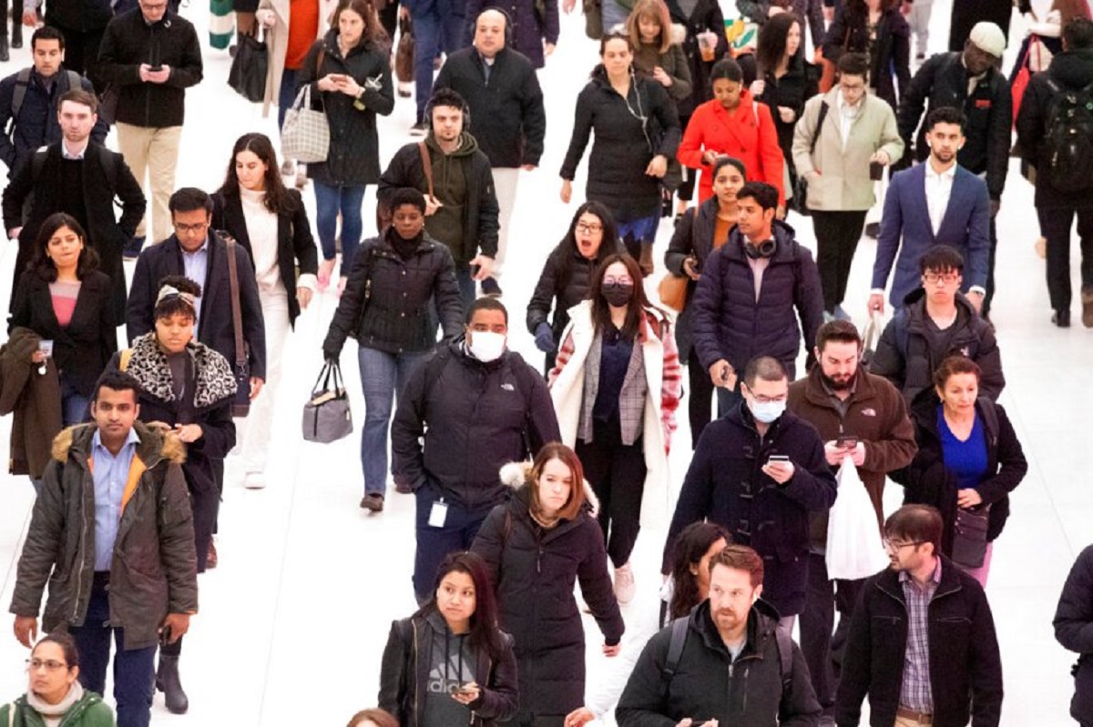 Three commuters, center, wear masks as they walk through the World Trade Center transportation hub, Wednesday, March 4, 2020, in New York. (AP Photo/Mark Lennihan)