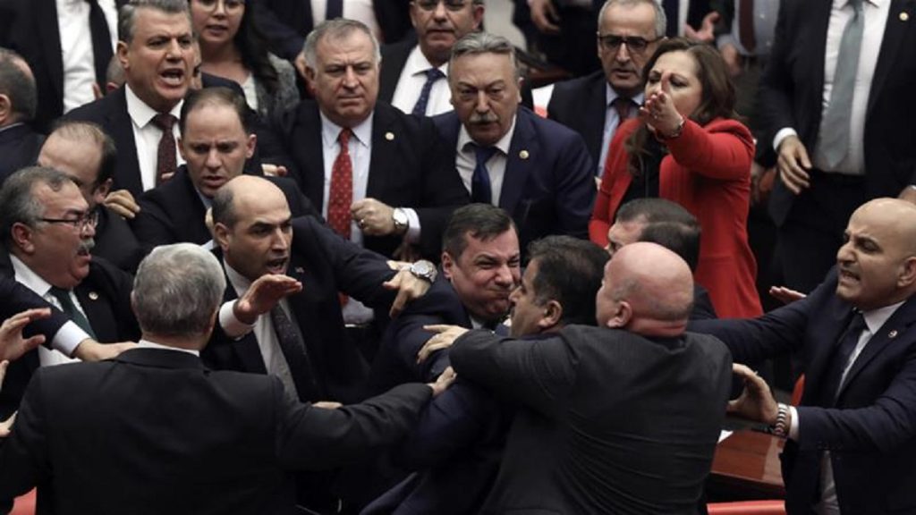 বিরোধী দলীয় এক আইনপ্রণেতা বক্তৃতায় প্রেসিডেন্ট রিসেপ তাইয়েপ এরদোগানকে নিয়ে অসম্মানজনক মন্তব্য করায় বুধবার তুরস্কের পার্লামেন্টে ঘুসাঘুসির ঘটনা ঘটেছে। এরদোগান সিরিয়ায় নিহত তুর্কিশ সেনাদের প্রতি অসম্মান করেছেন বলে অভিযোগ করেন ওই এমপি।