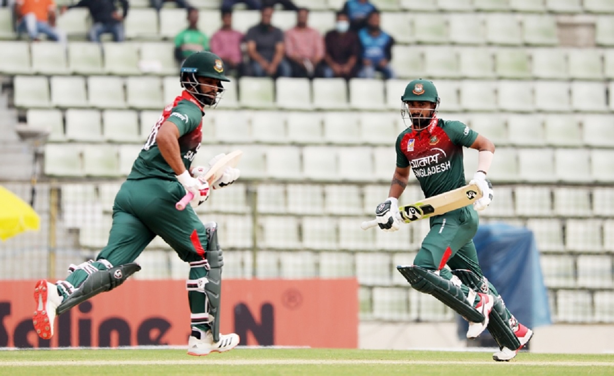 শুরুতেই উড়ন্ত সূচনা এনে দেন দুই ওপেনার। ওপেনিংয়ে রেকর্ড রান সংগ্রহ করেন তারা। ৩৩ ওভার দুই বল খেলে বিনা উইকেটে ১৮২ রান সংগ্রহ করে টাইগাররা। পরে বৃষ্টিতে বাধা পড়ে টাইগারদের ইনিংস।