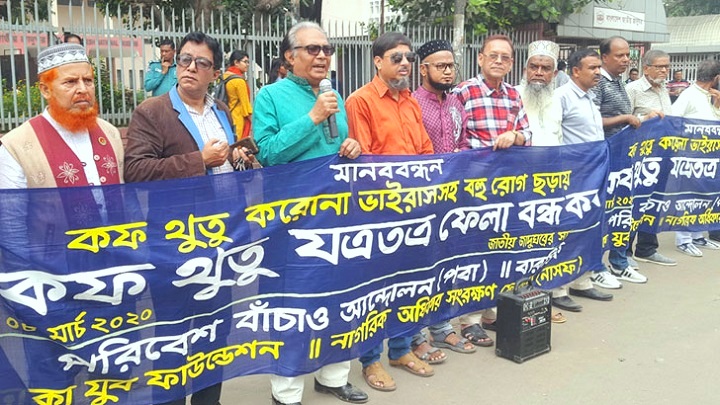 রোববার রাজধানীর শাহবাগে জাতীয় জাদুঘরের সামনে আয়োজিত ‘কফ-থুতু করোনাভাইরাসসহ বহু রোগ ছড়ায় : কফ-থুতু যত্রতত্র ফেলা বন্ধ করো’ শীর্ষক মানববন্ধনে পরিবেশবাদী সংগঠনগুলোর নেতারা এ দাবি করেন।