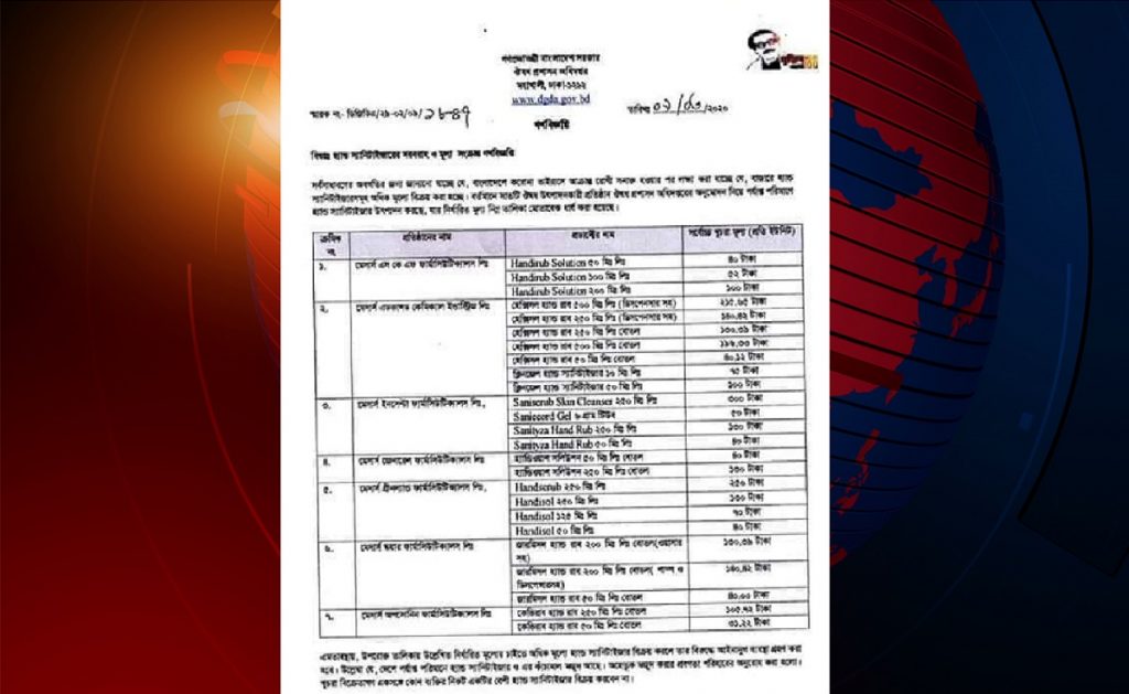 বিজ্ঞপ্তিতে বলা হয়,করোনাভাইরাসের সংক্রমণ প্রতিরোধে হ্যান্ড স্যানিটাইজারের সরবরাহ নিশ্চিত ও মূল্য নিয়ন্ত্রণ বিষয়ে সভা অনুষ্ঠিত হয়। ঔষধ প্রশাসন অধিদফতরের মহাপরিচালক মেজর জেনারেল মো মাহবুবুর রহমানের সভাপতিত্বে সভায় উপস্থিত ছিলেন, বাংলাদেশ ঔষধ শিল্প সমিতি, ঔষধ উৎপাদনকারী ও বিক্রয়কারী প্রতিষ্ঠান সমূহের প্রতিনিধিরা।