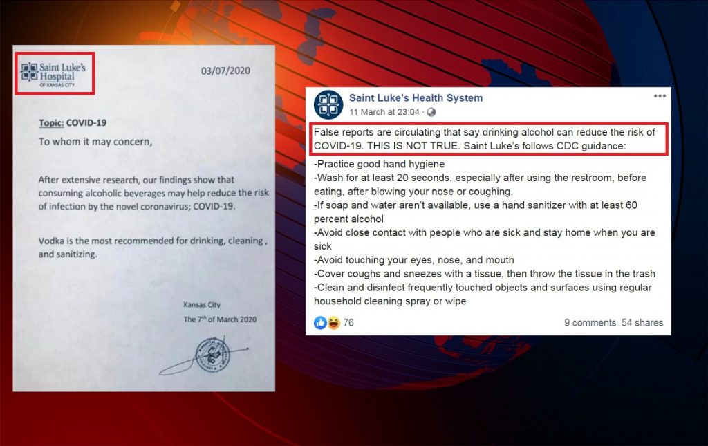 মার্কিন যুক্তরাষ্ট্রের কানসাসের সেইন্ট লুকিস হাসপাতালের প্যাডে এমন নির্দেশনা সম্বলিত এক বার্তায় লিখা ছিল যে ‘গবেষণা করে দেখা গেছে অ্যালকোহল পানের কারণে করোনাভাইরাস আক্রান্তের ঝুঁকি কমে যেতে পারে।’