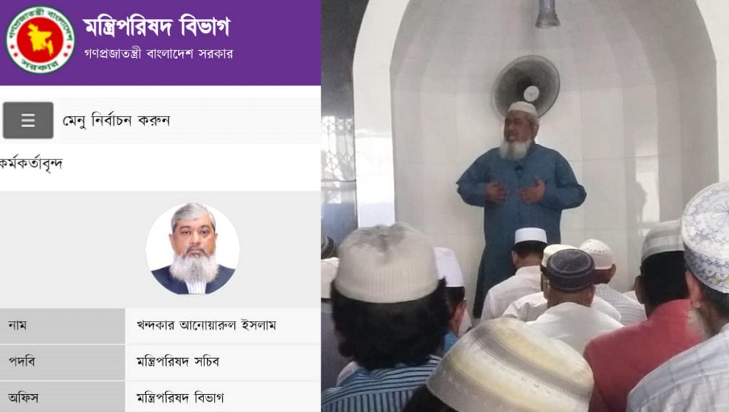 গত বৃহস্পতিবার সচিবালয় কেন্দ্রীয় মসজিদে জোহরের নামাজ পড়তে যান একজন সরকারি কর্মকর্তা। যিনি সরকারে আর্থিক প্রতিষ্ঠান বিভাগে কর্মরত। সেখানে নামাজ শেষে মোনাজাতের আগে ইমাম সাহেব করোনাভাইরাসের মহামারি বিষয়ে সতর্কতামূলক বয়ান শুরু করলেন। বক্তব্যে আধুনিক চিকিৎসা বিজ্ঞান ও কোরআন-হাদিসের রেফারেন্স দিচ্ছিলেন। তার বক্তব্যে মুগ্ধ হয়ে পাশের মুসল্লিকে জিজ্ঞাসা করেন, ইমাম হুজুর কি এই মসজিদে নতুন যোগদান করেছেন? কেননা এরকম আগে কখনো দেখা যায়নি। প্রশ্নের যে উত্তর পান তাতে অবাকই হলেন তিনি। বক্তা আসলে, সচিবালয় মসজিদের ইমাম নন; তবে তিনি প্রায় প্রতি কর্মদিবসেই সচিবালয় কেন্দ্রীয় মসজিদে জোহরের নামাজের ইমামতি করেন। এবং কোনো জরুরি বিষয় থাকলে খুতবার মতো করে খোলামেলা আলাপও করেন। তিনি হলেন বাংলাদেশ সরকারের মন্ত্রিপরিষদ সচিব খন্দকার আনোয়ারুল ইসলাম।