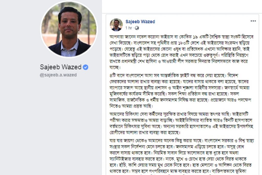 সজীব ওয়াজেদ জয়ের স্ট্যাটাসটি হুবহু তুলে দেয়া হলো-