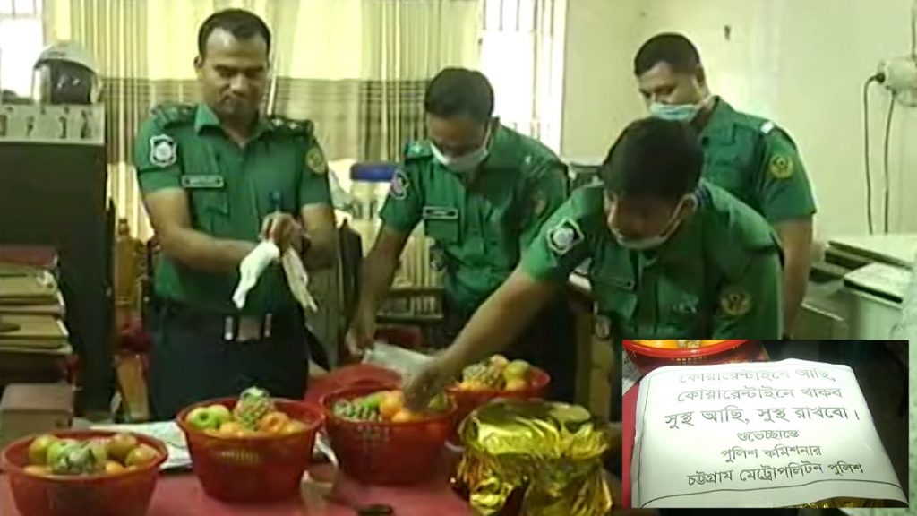 চট্টগ্রামে হোম কোয়ারেন্টাইনে থাকা প্রবাসীদের ফলমুলসহ খাদ্য সামগ্রী বিতরণ করছে চট্টগ্রাম মেট্রোপলিটন পুলিশ।