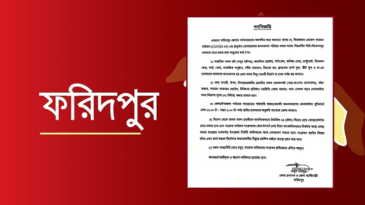 আজ সোমবার ফরিদপুরের জেলা প্রশাসক অতুল সরকার স্বাক্ষরিত এক গণবিজ্ঞপ্তিতে এ ঘোষণা দেয়া হয়।