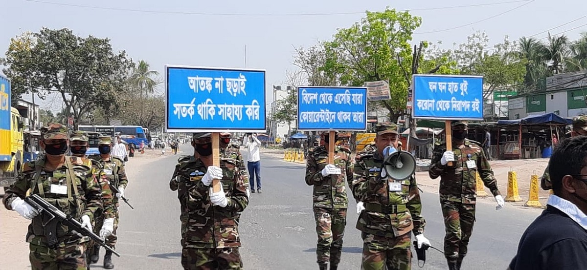 প্রাণঘাতী মহামারি করোনাভাইরাসের সংক্রমণ ও বিস্তার রোধে বেসামরিক প্রশাসনের সহায়তায় গত মঙ্গলবার থেকেই দেশব্যাপী মাঠে নেমেছে সেনাবাহিনীর বিভিন্ন দল। এরমাঝে, প্রবাসীদের হোম কোয়োরেন্টাইন, সামাজিক দুরত্ব নিশ্চিত করাসহ করোনার বিস্তার রোধে নানা সচেতনামূলক কার্যক্রম পরিচালনা করছে তারা।