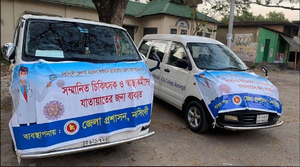 করোনাভাইরাস পরিস্থিতিতে গণপরিবহন সংকট দেখা দেয়ায় নরসিংদীর দুটি সরকারি হাসপাতালে চিকিৎসক ও সেবিকাদের উপস্থিতি নিশ্চিত করতে হাসপাতালে যাতায়াতের জন্য চারটি শীতাতপ নিয়ন্ত্রিত গাড়ি (মাইক্রোবাস) বরাদ্দ দিয়েছে জেলা প্রশাসন।