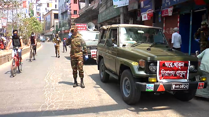 সামাজিক দূরত্ব বজায় রাখতে সকাল থেকেই বগুড়ায় তৎপরতা দেখা যায় সেনা সদস্যদের। শহরের বড়গোলা মোড়, রাজাবাজার ও কাঁঠালতলা এলাকায় জনসাধারণের ভিড় কমাতে কাজ করেন সেনাসদস্যরা।