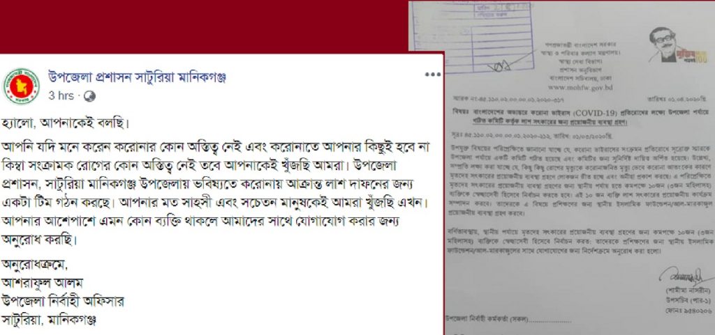এই স্ট্যাটাসের নিচে স্বাস্থ্য ও পরিবার কল্যাণ মন্ত্রণালয়ের একটি বিজ্ঞপ্তি সংযুক্ত করা হয়েছে যেখানে করোনায় মারা যাওয়া ব্যক্তিদের মৃতদেহ সৎকারে এলাভিত্তিক স্বেচ্ছাসেবকদের সম্পৃক্ত করা ও তাদের প্রশিক্ষণের নির্দেশ দেয়া হয়েছে।