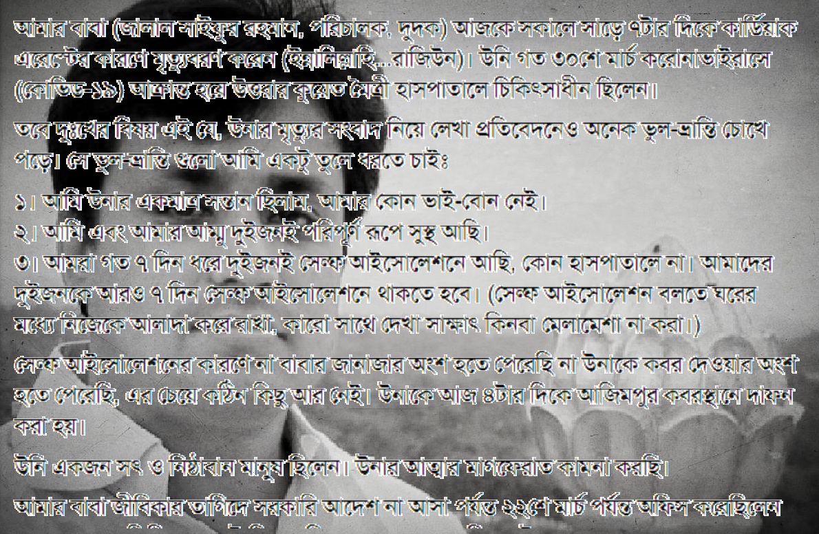 আমার বাবা (জালাল সাইফুর রহমান, পরিচালক, দুদক) আজকে সকালে সাড়ে ৭টার দিকে কার্ডিয়াক এরেস্টের কারণে মৃত্যুবরণ করেন (ইন্নালিল্লাহি…রাজিউন)। উনি গত ৩০শে মার্চ করোনাভাইরাসে (কোভিড-১৯) আক্রান্ত হয়ে উত্তরার কুয়েত মৈত্রী হাসপাতালে চিকিৎসাধীন ছিলেন।