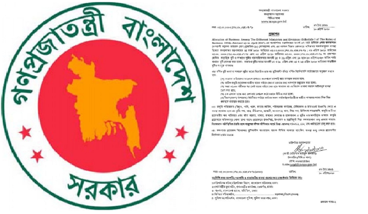 শুক্রবার জনপ্রশাসন মন্ত্রণালয় থেকে ছুটি বাড়ানোর আদেশ জারি করা হয়েছে। ৫ শর্তের মধ্যে প্রথমটি হলো- করোনাভাইরাসের সংক্রমণ প্রশমনে জনগণকে অবশ্যই ঘরে অবস্থান করতে হবে।