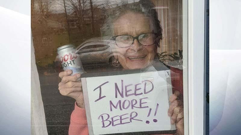 পেনসিলভেনিয়ার ৯৩ বছর বয়সী এক বৃদ্ধা অলিভ ভেরোনেসাই পড়েছেন এক বড় সমস্যায়। যে কোনভাবে এই সংকট থেকে তাকে বের হতে হবে। তবে তিনি জরুরি খাদ্য সংকটে পড়েননি, পড়েছেন ‘বিয়ার’ সংকটে। তাই লকডাউনে বিয়ার সরবরাহ নিশ্চিত করতে বাসার স্বচ্ছ কাচের জানালা দিয়ে ‘আই নিড মোর বিয়ার’ প্ল্যাকার্ড তুলে ধরলেন।