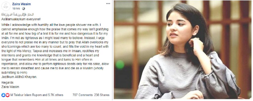 তিনি লিখেছেন, আসসালামুআলাইকুম। আমি স্বীকার করছি মানুষ আমাকে অনেক ভালোবাসা দিয়েছেন। কিন্তু আমার মনে হচ্ছে আপনাদের পক্ষ থেকে আসা প্রশংসা আমার জন্য বড় পরীক্ষা এবং এটি আমার ঈমানের জন্যও বিপজ্জনক। আমি করজোড়ে অনুরোধ করছি, আপনারা আমার প্রশংসা করবেন না। জায়রা আরও লিখেছেন, আমার জন্য দোয়া করবেন আল্লাহ যেনো আমার ভুলগুলো মাফ করে দেন। আমার হৃদয় তাকওয়া ও ঈমানের আলো দিয়ে ভরিয়ে দেন। আমি যেন সব সময় সৎকর্ম করতে পারি এবং মহান আল্লাহ যেন আমাকে একজন মুসলিম হয়ে বাঁচার এবং মরার তৌফিক দেন।