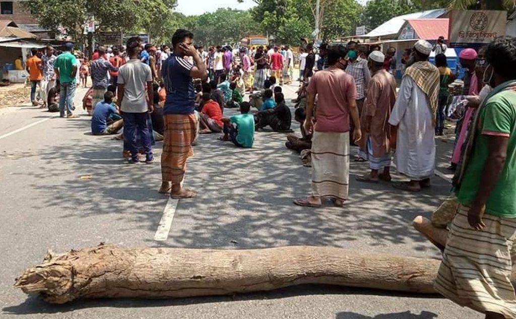 ত্রাণের দাবিতে রবিবার সকাল ১০টার দিকে সিরাজগঞ্জের উল্লাপাড়া উপজেলার দূর্গানগর ইউনিয়নের বালসাবাড়ি বাজার এলাকায় বগুড়া-নগরবাড়ি মহাসড়কে গাছ ফেলে তাঁত শ্রমিক ও নদী ভাঙ্গণে ক্ষতিগ্রস্ত মানুষ বিক্ষোভ করে।