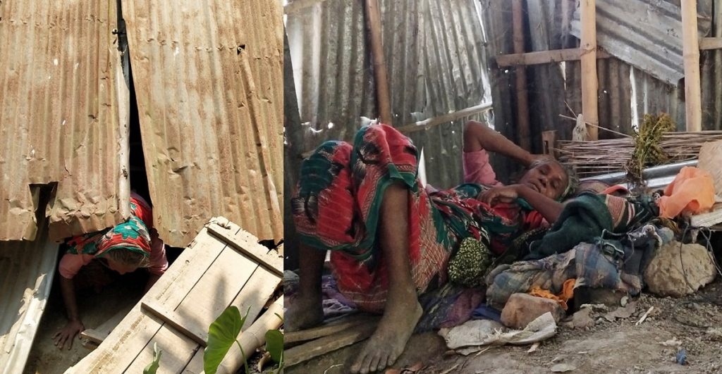 ভিক্ষাবৃত্তি আর অন্যের বাড়িতে কাজ করেই চলে মা-মেয়ের সংসার। ভাগ্যের কি নির্মম পরিহাস ঝড়ে বছর তিনেক আগে একমাত্র থাকার টিন সেডের ঘরটি ভেঙ্গে যায়। ভিক্ষা করে যা আয় হয় তা দিয়েই চলে যায় দিন। সেখানে ঘর ঠিক করাটা যেন একটা দু:স্বপ্ন ছাড়া আর কিছুই না। অর্থাভাবে ঘরটি ঠিকঠাক করার সামর্থ্য হয়নি বৃদ্ধা ছালেহা বেওয়ার। তাই দীর্ঘদিন ধরে ভেঙ্গে পড়া ঘরের দরজা-জানালা না থাকায় টিন ফাঁকা করে হামাগুড়ি দিয়ে ঢোকেন এবং বের হন বৃদ্ধা ছালেহা বেওয়া। হামাগুড়ি দিয়ে প্রবেশ করে মাটিতেই ছেড়া-ফাঁটা কাপড় এবং কাঁথা দিয়ে বিছানা করে ঘুমাতে হয় তাকে। আর পাশে একটা ঝুপড়ি ঘরের ব্যবস্থা করে মেয়ে শাহিদা থাকেন।