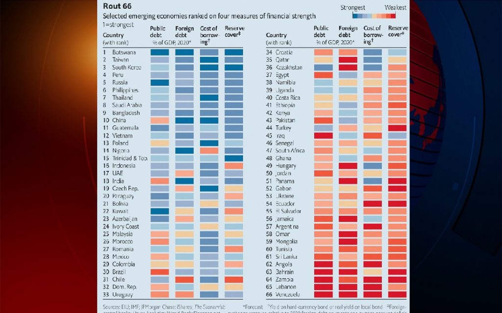 চারটি নির্বাচিত খাতের অর্থনৈতিক দুর্বলতা পরীক্ষা করে এ তালিকা করা হয়েছে। সেগুলো হলো- সরকারি ঋণ জিডিপির কত শতাংশ, বৈদেশিক ঋণ (সরকারি ও বেসরকারি উভয়ই), ঋণ গ্রহণের ব্যয় এবং রিজার্ভের আওতা।