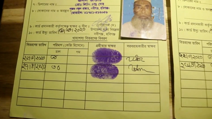 স্থানীয় ডিলার জননী ভান্ডার থেকে ১০ টাকা কেজি দরে চাল কেনার জন্য এসব কার্ড ইস্যু হয় মার্চের শুরুতে। নিয়ম অনুযায়ী মার্চ থেকেই চাল বিক্রির কথা থাকলেও সুবিধাভোগীদের অভিযোগ, তাদের ১ মাসের চাল দেয়া হয় এপ্রিলের শেষে। আর কার্ডে আগে থেকেই ছিল টিপসই।