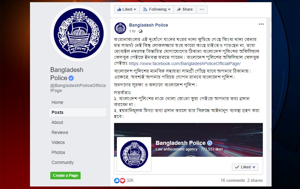 ‘করোনাকা‌লের এই দু‌র্যো‌গে যা‌দের ঘ‌রের খাদ্য ফু‌রি‌য়ে গে‌ছে কিংবা খাদ্য কেনার মত সামর্থ্য নেই কিন্তু লোকলজ্জার ভ‌য়ে কারো কা‌ছে চাই‌তেও পার‌ছেন না, তারা মোবাইল নম্বরসহ বিস্তারিত যোগাযোগের ঠিকানা বাংলা‌দেশ পু‌লি‌শের অ‌ফি‌সিয়াল ফেসবুক পেইজে ইনবক্স করতে পারেন। বাংলাদেশ পুলিশের অফিসিয়াল ফেসবুক পেইজঃ Bangladesh Police