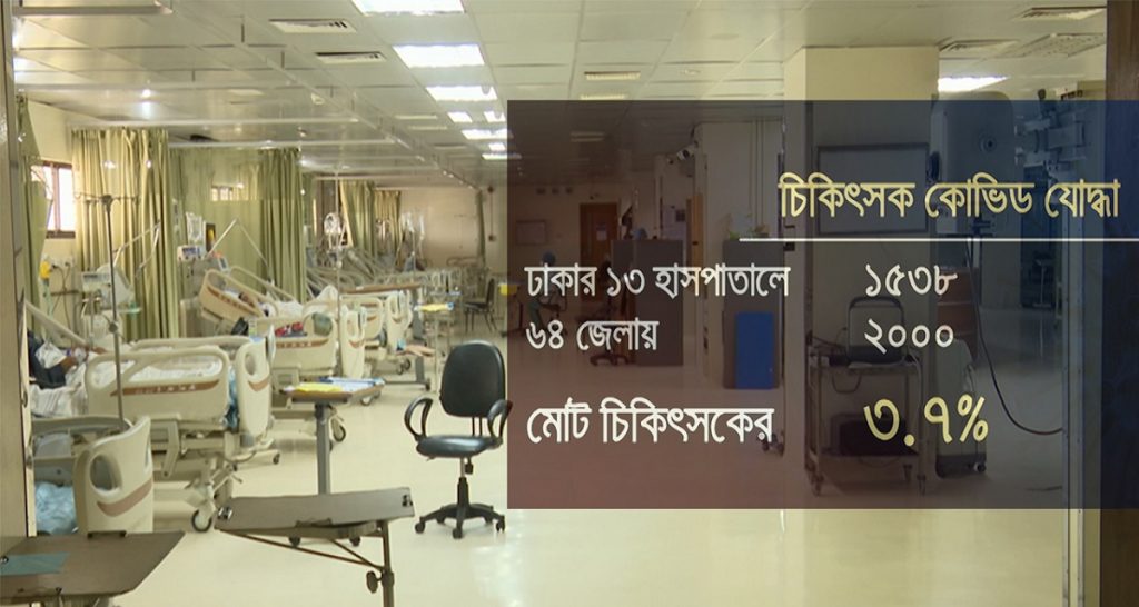 করোনা মোকাবিলায় ঢাকার ১৩ টি হাসপাতালে প্রায় তিন হাজার বেডের জন্য চিকিৎসক আছেন ১৫৩৮জন। এরমধ্যে সরকারি ১০টি আর বেসরকারি ৩টি হাসপাতাল। ঢাকার বাইরে সারাদেশে ৬ হাজার বেডের জন্য নিযুক্ত আরও প্রায় দুই হাজার চিকিৎসক। নিজের ও পরিবারের নিরাপত্তা ঝুঁকির পরও সেবা দিয়ে যাচ্ছেন এই সাড়ে তিন হাজার কোভিড যোদ্ধা।