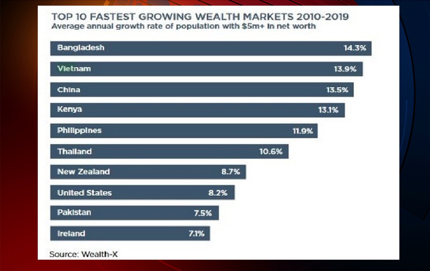 প্রতিবেদন অনুযায়ী ২০১০ থেকে ২০১৯ পর্যন্ত দ্রুত সম্পদশালী হওয়া বাজারগুলোতে ৫০ লাখ ডলারেরও বেশি সম্পদ এমন জনগোষ্ঠীর বার্ষিক গড় প্রবৃদ্ধি বাংলাদেশের ১৪ দশমিক ৩ শতাংশ। ভিয়েতনামে ১৩ দশমিক ৯ শতাংশ। তালিকার তৃতীয় অবস্থানে চীনের প্রবৃদ্ধি ১৩ দশমিক ৫ শতাংশ। চতুর্থ অবস্থানে থাকা কেনিয়ার ১৩ দশমিক ১ শতাংশ। পঞ্চম অবস্থানে ফিলিপাইনসের ১১ দশমিক ৯ শতাংশ।