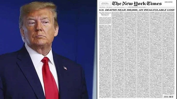 রোববার ‘নিউইয়র্ক টাইমস’ পত্রিকার প্রথম পাতায় ১ হাজার মৃত ব্যক্তির নাম ও পরিচয় প্রকাশ করা হয়েছে। উপরে বড় অক্ষরে লেখা হয়েছে ‘হিসাবের অসাধ্য ক্ষতি: যুক্তরাষ্ট্রে মৃত্যু ১ লাখ ছুঁতে চলেছে’।