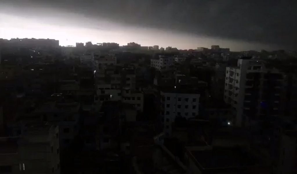 সকাল হয়েই রাত নেমে এলো ঢাকার আকাশে। আজ বুধবার রাতভর বৃষ্টি শেষে ভোরের আলো ফোটার পরই আবার কালো মেঘে রাত নেমে আসে রাজধানীর বুকে। বৃষ্টি আর ঝড়ো হাওয়ায় কেপে উঠে রাজধানীবাসী।