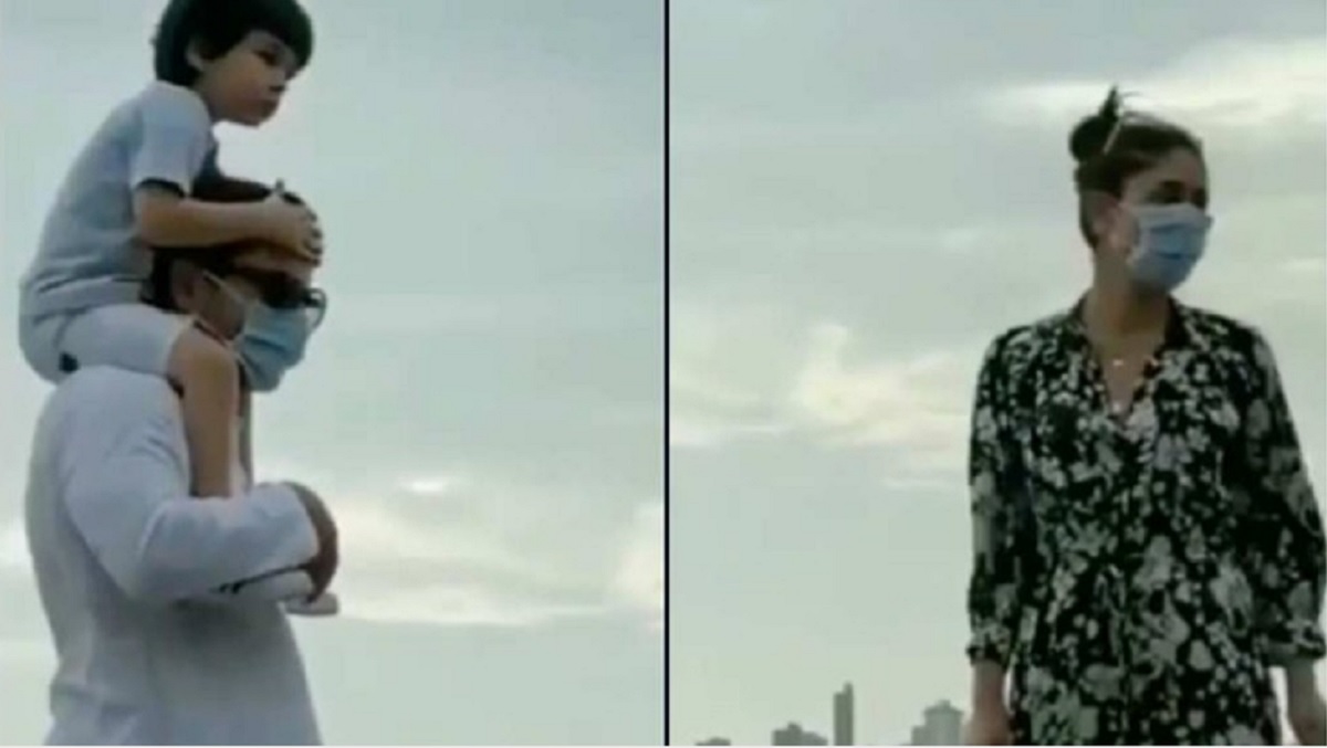 মাস্ক ছাড়া তৈমুর। যদিও মুখ ঢেকেছেন কারিনা-সাইফ। ছবি: সংগৃহীত