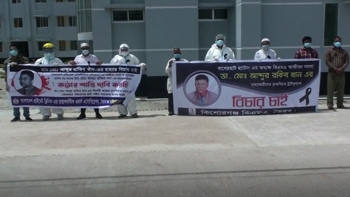 আজ সোমবার দুপুর দেড়টায় ভৈরব ট্রমা হাসপাতলের চত্বরে ডাক্তাররা সামাজিক নিরাপত্তা বজায় রেখে এ কর্মসূচি পালন করে। প্রতিবাদ সমাবেশে বক্তব্য রাখেন বিএমএ কেন্দ্রীয় কাউন্সিলের সদস্য ও ভৈরব উপজেলা স্বাস্থ্য ও পরিবার পরিকল্পনা কর্মকর্তা ডাঃ বুলবুল আহমেদ, আবাসিক মেডিক্যাল অফিসার ডাঃ কিশোর কুমার ধর, ডাঃ সাদিয়া সুলতানা প্রমুখ। পরে ডাক্তারা ডা. আব্দুর রকিব খানের স্মরণে ১ মিনিট নীরবতা পালন করেন।