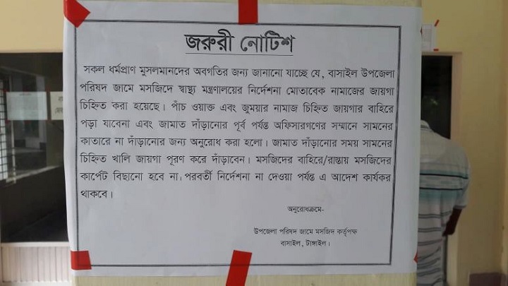 মসজিদ কর্তৃপক্ষের নোটিশে বলা হয়েছে- ‘সকল ধর্মপ্রাণ মুসলমানদের অবগতির জন্য জানানো যাচ্ছে যে, বাসাইল উপজেলা পরিষদ জামে মসজিদে স্বাস্থ্য মন্ত্রণালয়ের নির্দেশনা মোতাবেক নামাজের জায়গা চিহ্নিত করা হয়েছে। পাঁচ ওয়াক্ত এবং জুমার নামাজ চিহ্নিত জায়গার বাহিরে পড়া যাবে না এবং জামাত দাঁড়ানোর পূর্ব পর্যন্ত অফিসারগনের সম্মানে সামনের কাতারে না দাঁড়ানোর জন্য অনুরোধ করা হলো। জামাত দাঁড়ানোর সময় সামনের চিহ্নিত খালি জায়গা পূরণ করে দাঁড়াবেন। মসজিদের বাহিরে/রাস্তায় মসজিদের কার্পেট বিছানো হবে না, পরবর্তী নির্দেশনা না দেয়া পর্যন্ত এ আদেশ কার্যকর থাকবে।’